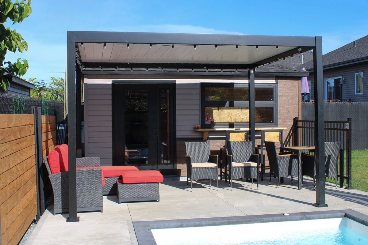 Dotée de persiennes à toit en aluminium, cette pergolas double mur permet d’ajuster la lumière entrant dans la structure.